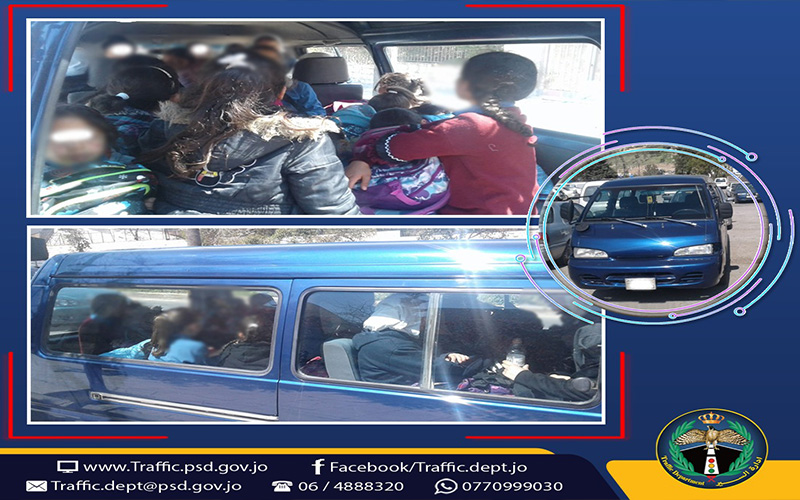 نيسان ـ ضبط العاملون في قسم المباحث المرورية بإدارة السير، أحد باصات النقل المشترك في منطقة عبدون يرتكب مخالفة تحميل ركاب زيادة، حيث كان بداخل الباص (18طالبا) زيادة عن الحد المقرر مما عرض حياتهم للخطر، بالإضافة لعجزه عن إبراز رخصة الاقتناء، والتي تبين أنها منتهية من شهر تشرين أول لعام2018.