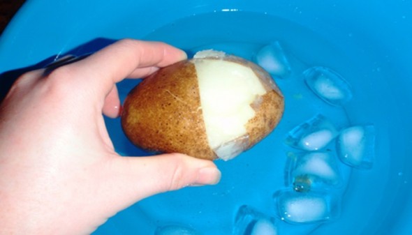 امسكي البطاطا المطبوخة ولفي السكين على القشرة وكأنك تقسمين البطاطا قسمين، ضعيها في ماء مثلج لدقيقتين، اخرجيها واسحبي القشور كاملة بسهولة.