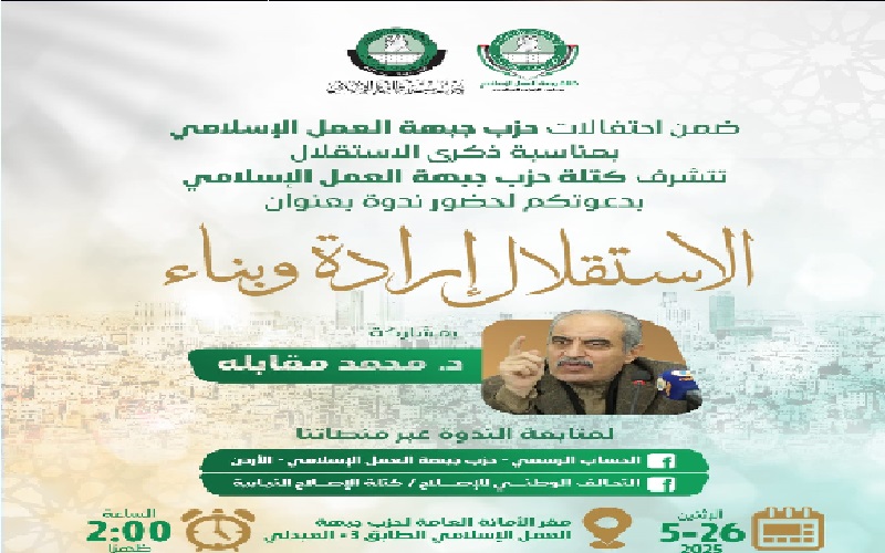 نيسان ـ تنظم كتلة حزب جبهة العمل الإسلامي ندوة بعنوان ( الاستقلال إرادة وبناء) ذلك ضمن احتفالات حزب جبهة العمل الإسلامي بمناسبة ذكرى الاستقلال 79 .