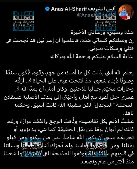 إن وصلَتكم كلماتي هذه، فاعلموا أن إسرائيل قد نجحت في قتلي وإسكات صوتي.