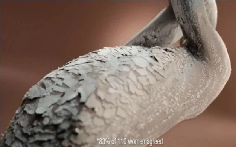 وتضمّن الإعلان مشاهد لسيدة سمراء اللون تظهر على بشرتها خدوش وعلامات جفاف، وأخرى تغطيها طبقة طينية متشققة، ترافقها عبارة صوتية: "إلى من قد يحكّون جلدهم ليلاً ونهاراً، وإلى من تجف بشرتهم حتى بفعل الماء".