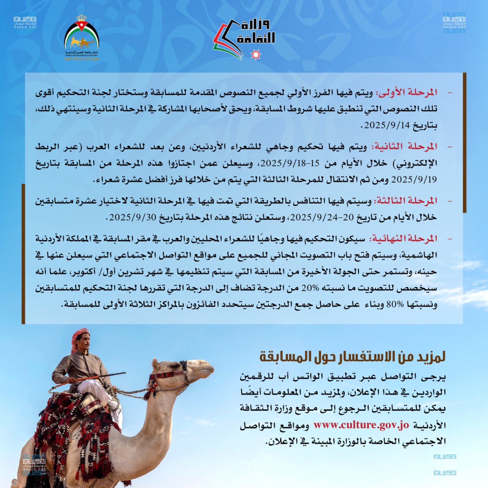 المرحلة الثانية ويتم فيها تحكيم وجاهي للشعراء الأردنيين، وعن بعد للشعراء العرب (عبر الربط الإلكتروني) خلال الأيام من 15-18/9/2025 ، وسيعلن عمن اجتازوا هذه المرحلة من المسابقة بتاريخ 19/9/2025 ومن ثم الانتقال للمرحلة الثالثة التي يتم من خلالها فرز أفضل عشرة شعراء.