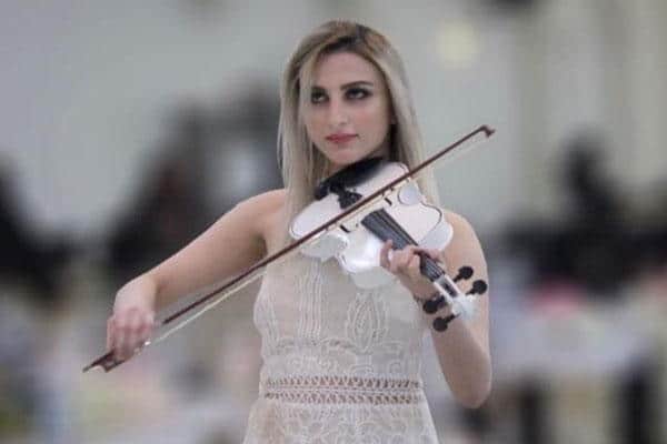 وتظهر عازفة 'الكمان' إلى جانب الدرج الذي ينزل منه العروسان وهي تعزف سمفونية موسيقية بفستان أبيض قصير شفاف ولا تغطي بطانته إلا أجزاء بسيطة من جسدها