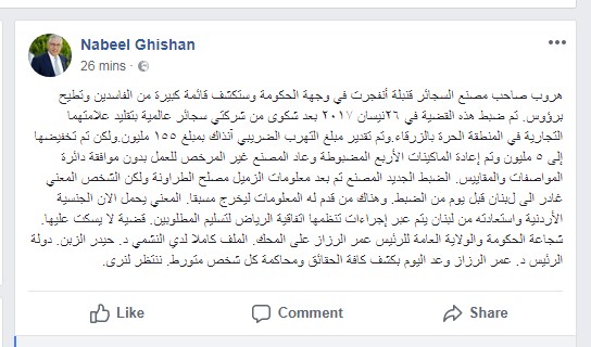 هروب صاحب مصنع السجائر قنبلة أنفجرت في وجهة الحكومة وستكشف قائمة كبيرة من الفاسدين وتطيح برؤوس. تم ضبط هذه القضية في ٢٦نيسان ٢٠١٧ بعد شكوى من شركتي سجائر عالمية بتقليد علامتهما التجارية في المنطقة الحرة بالزرقاء.وتم تقدير مبلغ التهرب الضريبي آنذاك بمبلغ ١٥٥ مليون.