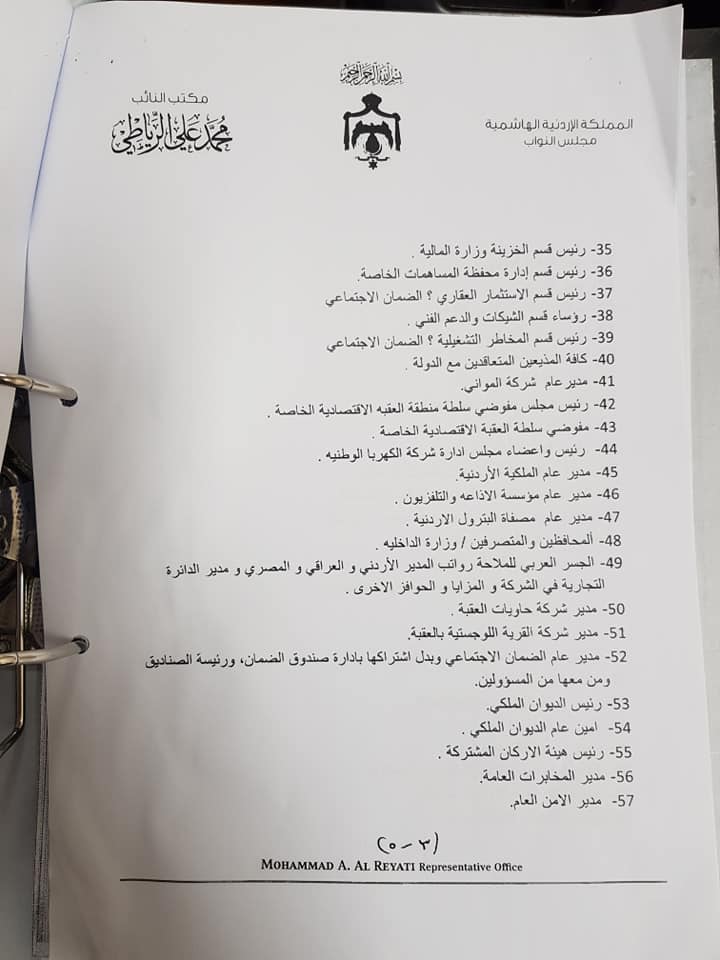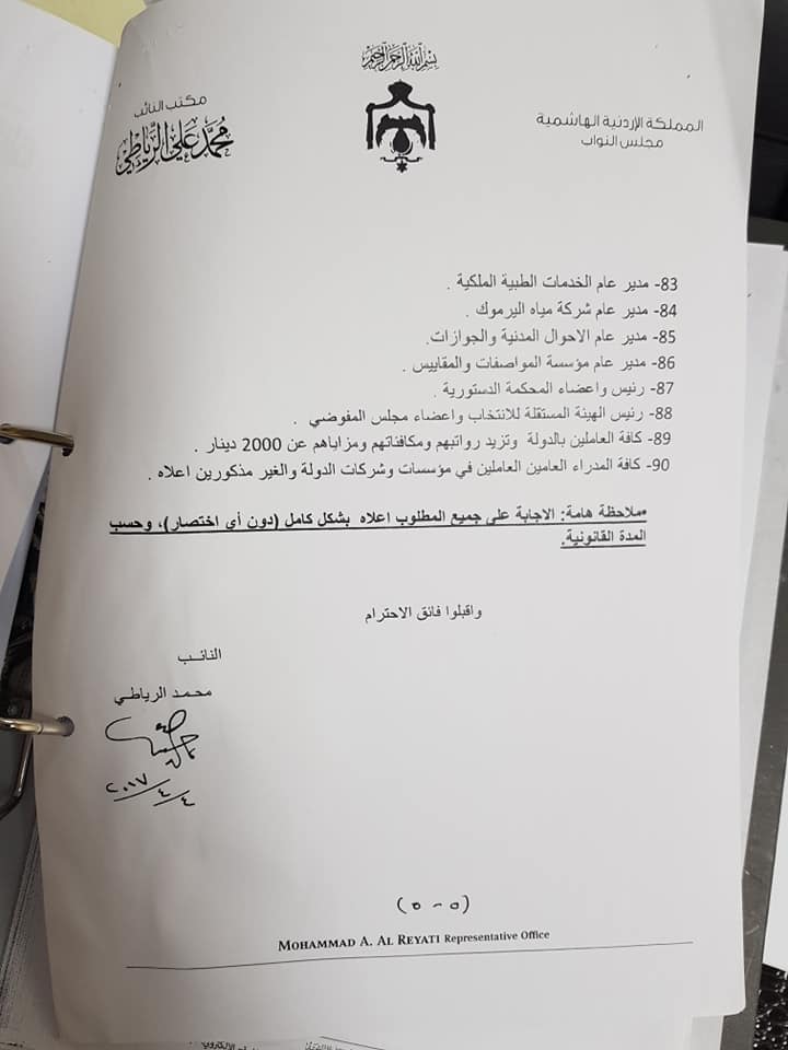 وطالب الرياطي الرزاز بالكشف عن المبالغ المدفوعة شهريا لـ ٩٠ مسؤولا، تتضمن اجمالي الراتب والمكافآت وبدل جلسات اللجان وبدل التنقلات ومياومات السفر وبدل الاجهزة الخلوية اضافة الى التقاعد وأي مزايا اخرى.