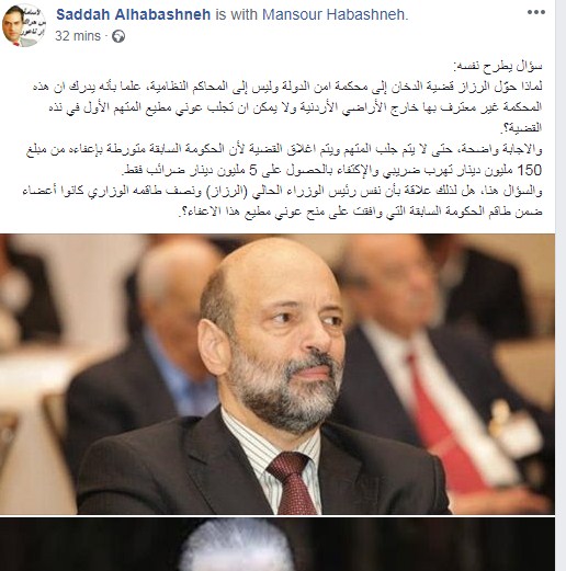 نيسان ـ غمز النائب صداح الحباشنة إلى علاقة أعضاء في فريق حكومة الدكتور عمر الرزاز ممن شاركوا بحكومة الدكتور هاني الملقي السابقة بقضية الدخان والمتهم الرئيسي فيها عوني مطيع.وكتب الحباشنة في منشور له على صفحته في الفيسبك :ان هنالك تعمدا بارسال هذه القضية لمحكمة امن الدولة حتى لا يتم جلب المتهم و يتم اغلاق القضية لأن الحكومة السابقة متورطة بإعفاءه من مبلغ 150 مليون دينار تهرب ضريبي والإكتفاء بالحصول على 5 مليون دينار ضرائب فقط.