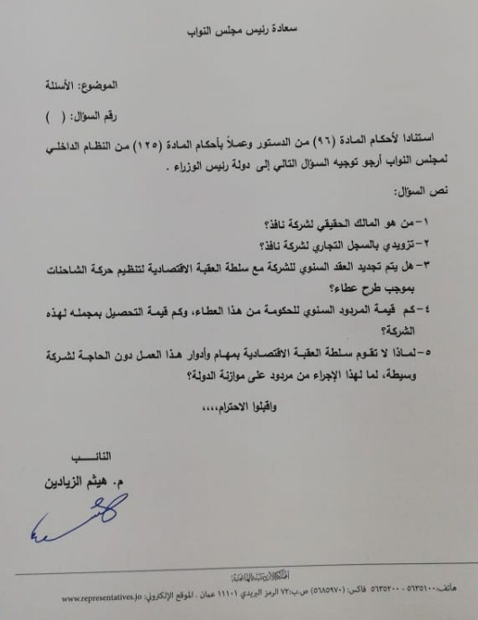 وجه النائب هيثم زيادين سؤالاً نيابياً الى رئيس الوزراء عمر الرزاز ، حول وجود شبهات 'تنفيعات' في عطاء حصلت عليه شركة 'نافذ1' لتنظيم دور الشاحنات في احدى الساحات المملوكة لسلطة العقبة.