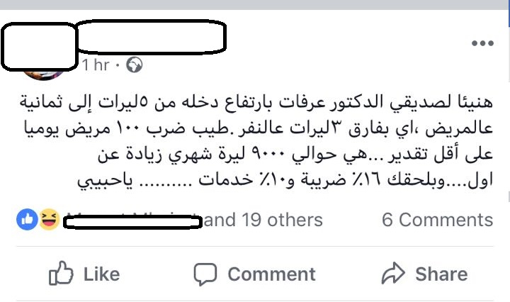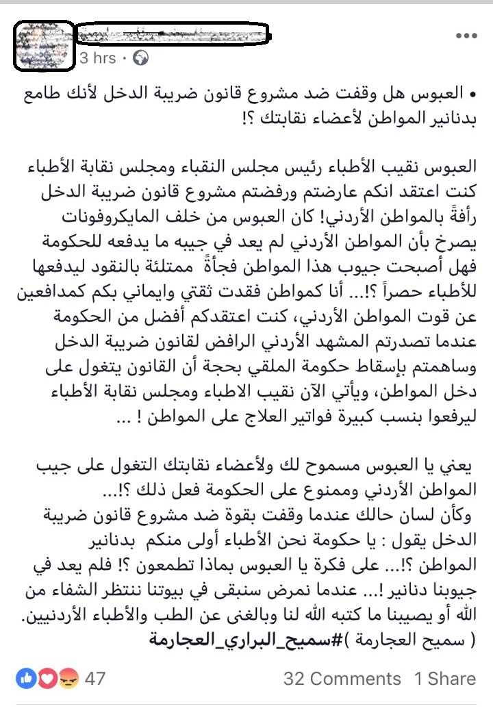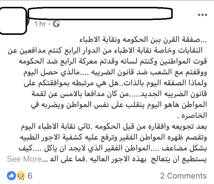و عبر عدد من نشطاء موقع التواصل الاجتماعي فيس بوك عن غبهم الشديد واستيائهم من قرار نقابة الاطباء برفع الاجور ، لافتين الى انه ابتعد عن الناحية الانسانية ، واعتمدت النقابة الجانب التجاري ، ولم تراعي الظروف المعيشية الصعبة التي يعيشها المواطن الاردني .