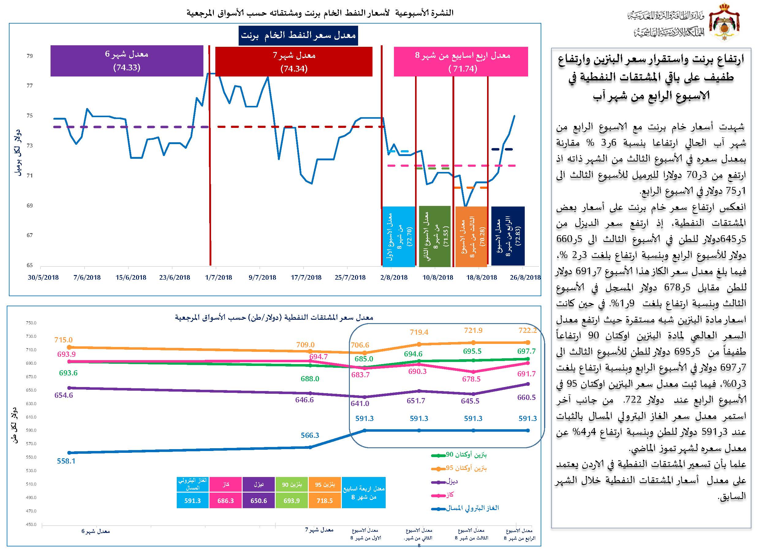 نيسان ـ أظهر المؤشر الاسبوعي لأسعار النفط والمشتقات البترولية للإسبوع الرابع من شهر آب الحالي، الصادر عن وزارة الطاقة، ارتفاع اسعار النفط.
