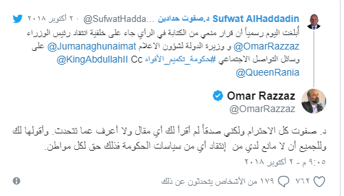 وأضاف الرزاز "أقولها لك وللجميع أن لا مانع لدي من انتقاد أي من سياسات الحكومة فذلك حق لكل مواطن".