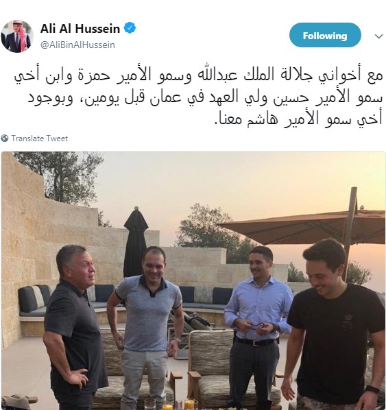 وتاليا نص التغريدة ..." مع أخواني جلالة الملك عبدالله وسمو الأمير حمزة وابن أخي سمو الأمير حسين ولي العهد في عمان قبل يومين، وبوجود أخي سمو الأمير هاشم معنا".