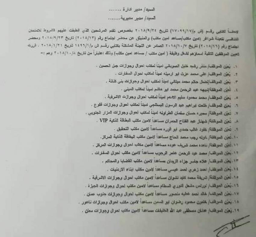 نيسان ـ قرر مدير عام دائرة الاحوال المدنية والجوازات ' فواز الشهوان ' تعيين 40 موظفا لشغل وظيفة امين مكتب ومساعد امين مكتب احوال .
