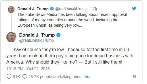 وقال ترامب في تغريدة على “تويتر”: “تتحدث وسائل الإعلام المزيفة أن الاستطلاعات الأخيرة عن سمعتي في الدول الأخرى، بما فيها بلدان الاتحاد الأوروبي، منخفضة. طبعا إنها منخفضة، لأنني أجعلهم يدفعون ثمنا باهظا لقاء قيامهم بأعمال حرة في الولايات المتحدة، وذلك لأول مرة خلال السنوات الـ50 الأخيرة. ولماذا يجب أن يحبونني؟”.