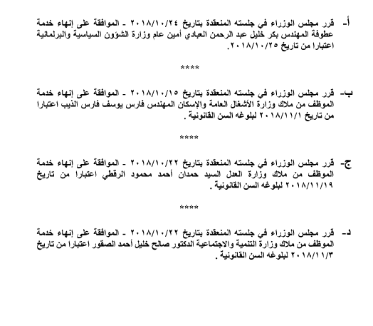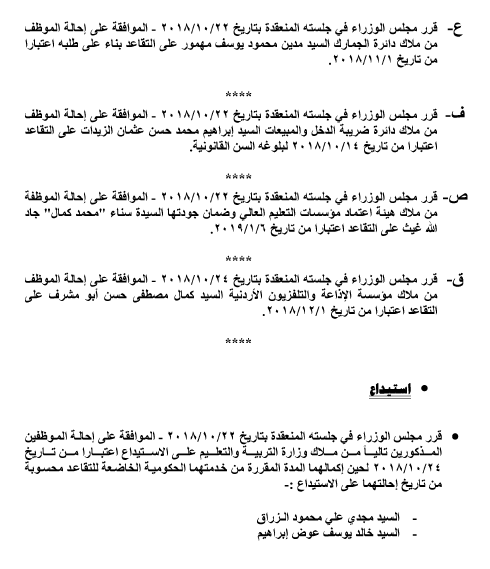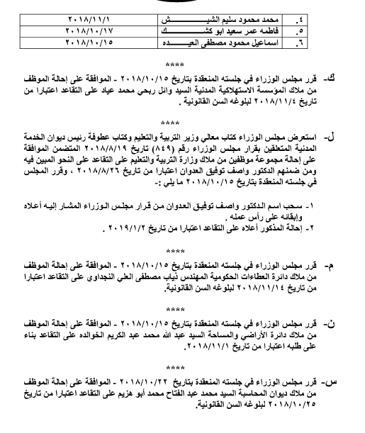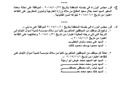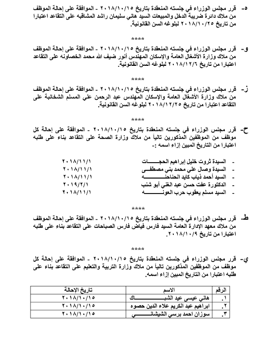 وافق مجلس الوزراء على إحالة موظفين في مختلف الوزارات والمؤسسات الحكومية على التقاعد، اعتبارا من التاريخ المبين إزاء اسم كلّ منهم.
