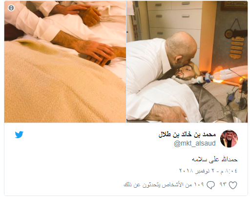 كما نشر الأمير محمد بن خالد صورتين لوالده في تغريدة ذيلها بالقول: “حمدالله على سلامه”.