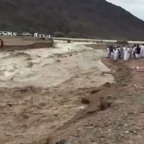 ويظهر أحد الفيديوهات على موقع "تويتر" كيف جرفت السيول القوية مجموعة من الشبان، بينما حاول مواطنون مساعدتهم، في مشهد مخيف.