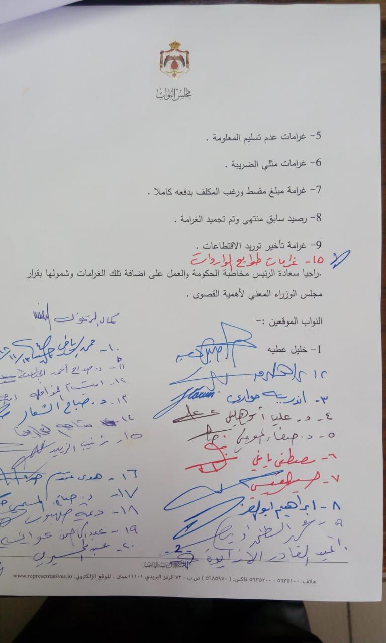 نحن النواب الموقعين ادناه وعطفا على قرار مجلس الوزراء رقم 1767 المتخذ بجلسته المنعقدة بتاريخ 31/10/2018 والمتضمن الموافقة على اسس جديدة لتفعيل اجراءات تحصيل الاموال العامة منذ سنوات والمنبثق عنه التعليمات التنفيذية لقرار مجلس الوزراء المتعلق بإعفاء المكلفين من الغرامات والفوائد في حال تسديد المستحقات واصل الضريبة وحيث ان القرار حصر الغرامات والفوائد والتعويض القانوني والتعويض المدني فيما يخص مطالبات ضريبة الدخل والمبيعات واية قضايا او مطالبات لم تشملها هذه التعليمات يتم النظر بها من قبل اللجنة التنفيذية وحتى لا يفسر مفهوم الغرامة المقصودة ويتم التأويل بها ومن اجل تطبيق المفهوم الواسع للغرامة لا بمفهومها الضيق بهذا المقام والتي ان تم اخذها بهذا المعنى ستهدم قرار مجلس الوزراء واهدافه وعليه نطالب الحكومة ان يؤخذ مفهوم الغرامة على اطلاق بحيث يضاف الى قرار مجلس الوزراء الغرامات التالية والتي ستعمل على انجاح قرار مجلس الوزراء واهدافه ومراميه :-