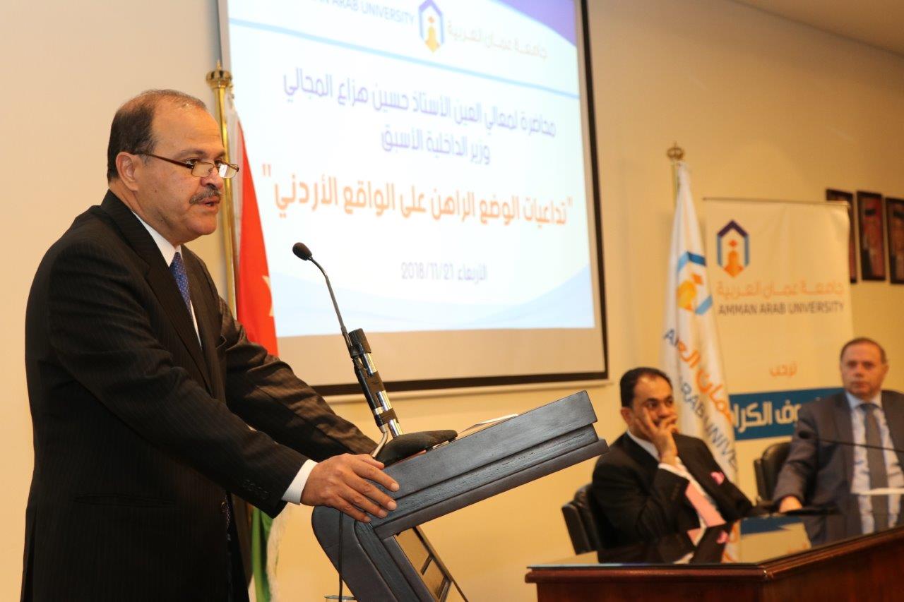 من جهته قال رئيس مجلس أمناء الجامعة الدكتورعمر الجازي إن نظرية الامن الناعم التي انتهجها الامن العام من العين المجالي كان لها أبلغ الاثر في تدعيم وتقوية موقف الاردن في المحافل الدولية، كونها أثبتت صوابية القرار والتطبيق والتي احترمت حرية الرأي والتعبير وحافظت على استقرار المجتمع والوطن".