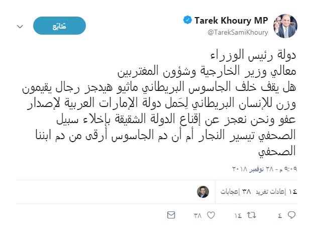 و قال النائب خوري مخاطبا وزير الخارجية ايمن الصفدي في تغريدة له على موقع التدوينات المصغر تويتر : دولة رئيس الوزراء معالي وزير الخارجية وشؤون المغتربين هل يقف خلف الجاسوس البريطاني ماثيو هيدجز رجال يقيمون وزن للإنسان البريطاني لِحَمل دولة الإمارات العربية لإصدار عفو .