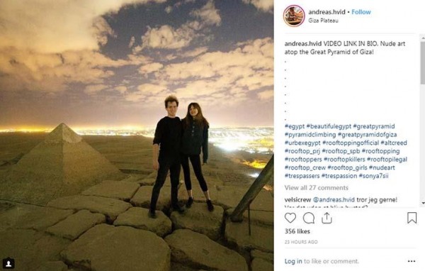 ونشر مصور دنماركي يدعى أندرياس هيفيد' لقطات فيديو برفقة من تبدو أنها صديقته يتسلقان الهرم الأكبر 'خوفو' بمنطقة الجيزة، للوصول إلى قمته، وتصوير مشاهد وصور جنسية، مما أثار ردود فعل غاضبة على مواقع التواصل الاجتماعي، حسب ما نقلت صحيفة 'الشروق' القاهرية، الخميس.