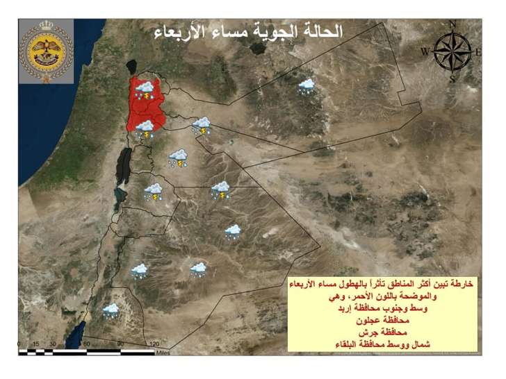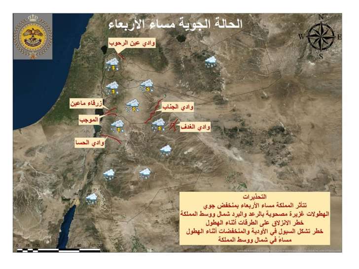 وبحسب تقرير دائرة الارصاد الجوية، يطرأ انخفاض على درجات الحرارة غدا، وتكون الأجواء باردة وغائمة وماطرة في مختلف مناطق المملكة، ويتوقع أن تكون الهطولات غزيرة أحياناً ومصحوبة بالبرق والرعد وتساقط حبات البرد، ما يؤدي إلى تشكل السيول في الأودية والمناطق المنخفضة ومناطق تجمع المطر، وتكون الرياح شمالية غربية نشطة السرعة مع هبات قوية أحياناً.