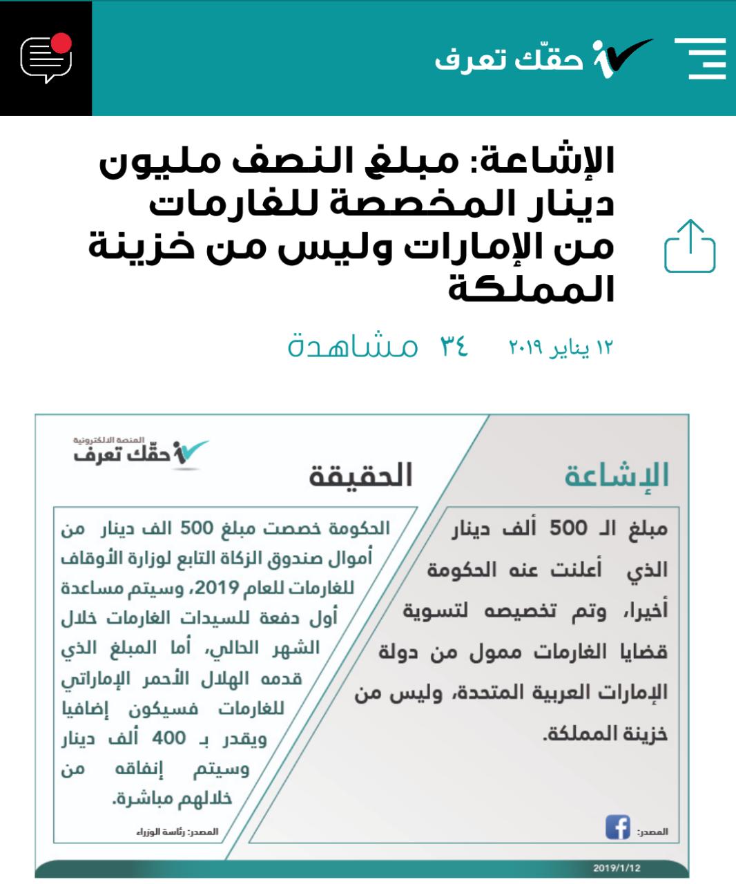 حيث أوضحت الحكومة عبر منصة "حقك تعرف" ان المبلغ من أموال صندوق الزكاة وسيتم مساعدة أول دقعة للغارمات خلال الشهر الحالي وأن المبلغ 400 الف دينار الذي قدمه الهلال الاحمر الاماراتي سيكون إضافياً وسيتم إنفاقه من خلالهم مباشرة .