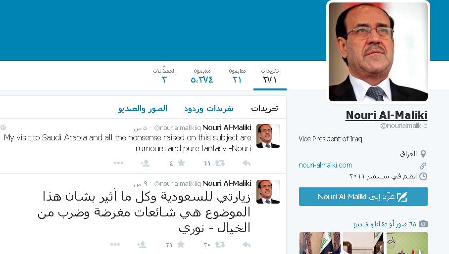 نحو حوالى 50 ألف تغريدة وفق التقديرات نُشرت على هذا الوسم، بعد تداول عدد من المغردين خبراً بمنع نائب الرئيس العراقي، نوري المالكي، من دخول السعودية، خلال ذهابه للتعزية بوفاة الأمير سعود الفيصل.