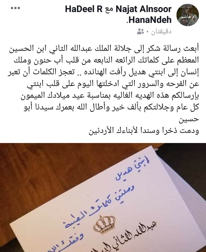 بوضوح ذكرت هديل أنها لا تتوقع أن تصل كلماتها إلى جلالة الملك، لكن توقعها لم يصب، بل وصلت كلماتها إلى الملك الأب الكبير ، الذي بادر ابنته برد أثلج صدرها، وأدخل الفرحة إلى قلبها، حين أرسل جلالته لها هدية ملكية وبطاقة كتب عليها بخط يده ابنتي هديل.. وصلتني كلماتك، وفقك الله .