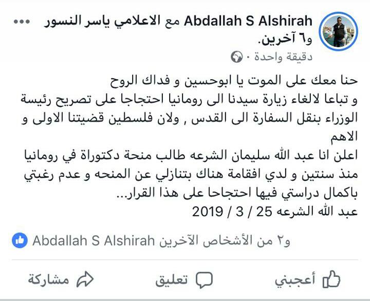 اعلن الطالب الاردني عبدالله الشرعة عبر صفحته على الفيس بوك ، تنازله عن منحة دكتواره في رومانيا ، وعدم رغبته باكمال دراسته، وذلك احتجاحا على تصريح رئيسة وزراء رومانيا بنقل السفارة الى القدس.