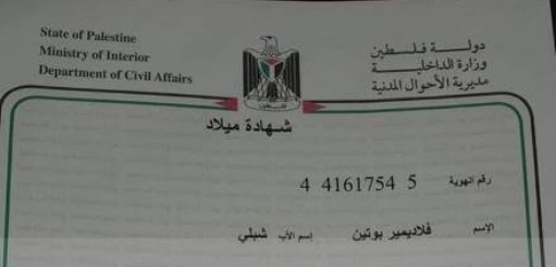 شهادة الميلاد التي وصلت منها نسخة اليوم الثلاثاء، تقول إن الاب شبلي جريس رزق الله فلطسني الجنسية أطلق اسم فلاديمير بوتين على مولوده.