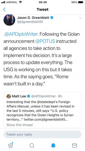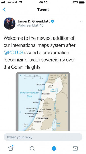 وقال غرينبلات في تغريدة عبر (تويتر): "مرحبًا بك في أحدث إضافة لنظام الخرائط الدولي الخاص بنا بعد إصدار الرئيس إعلانًا يعترف بالسيادة الإسرائيلية على مرتفعات الجولان".