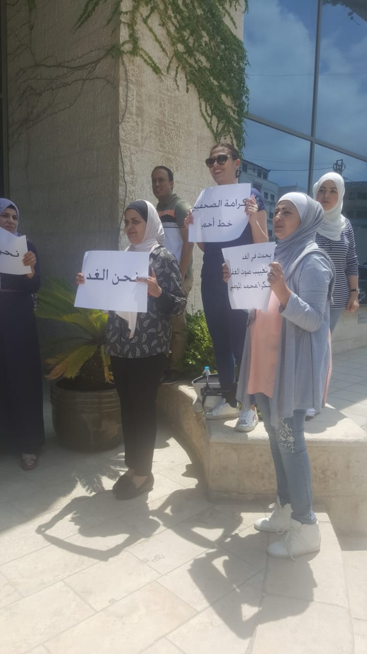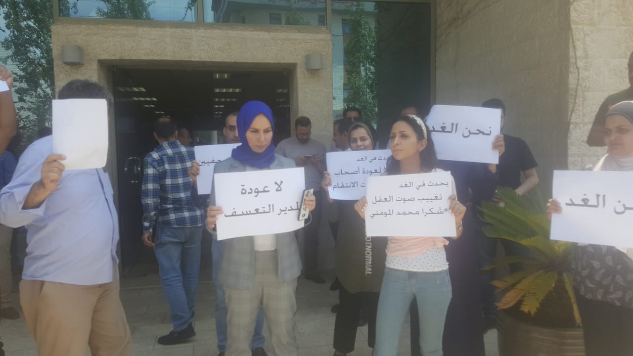 وطالب المعتصمون بالتراجع عن قرار انهاء عقد المومني، مشيرين أنه دفع أنه ثمن وقوفه وانحيازه إلى جانبهم طيلة الفترة الماضية، وخاصة في الأزمة الأخيرة التي ثارت في الصحيفة بسبب قرارات الادارة.