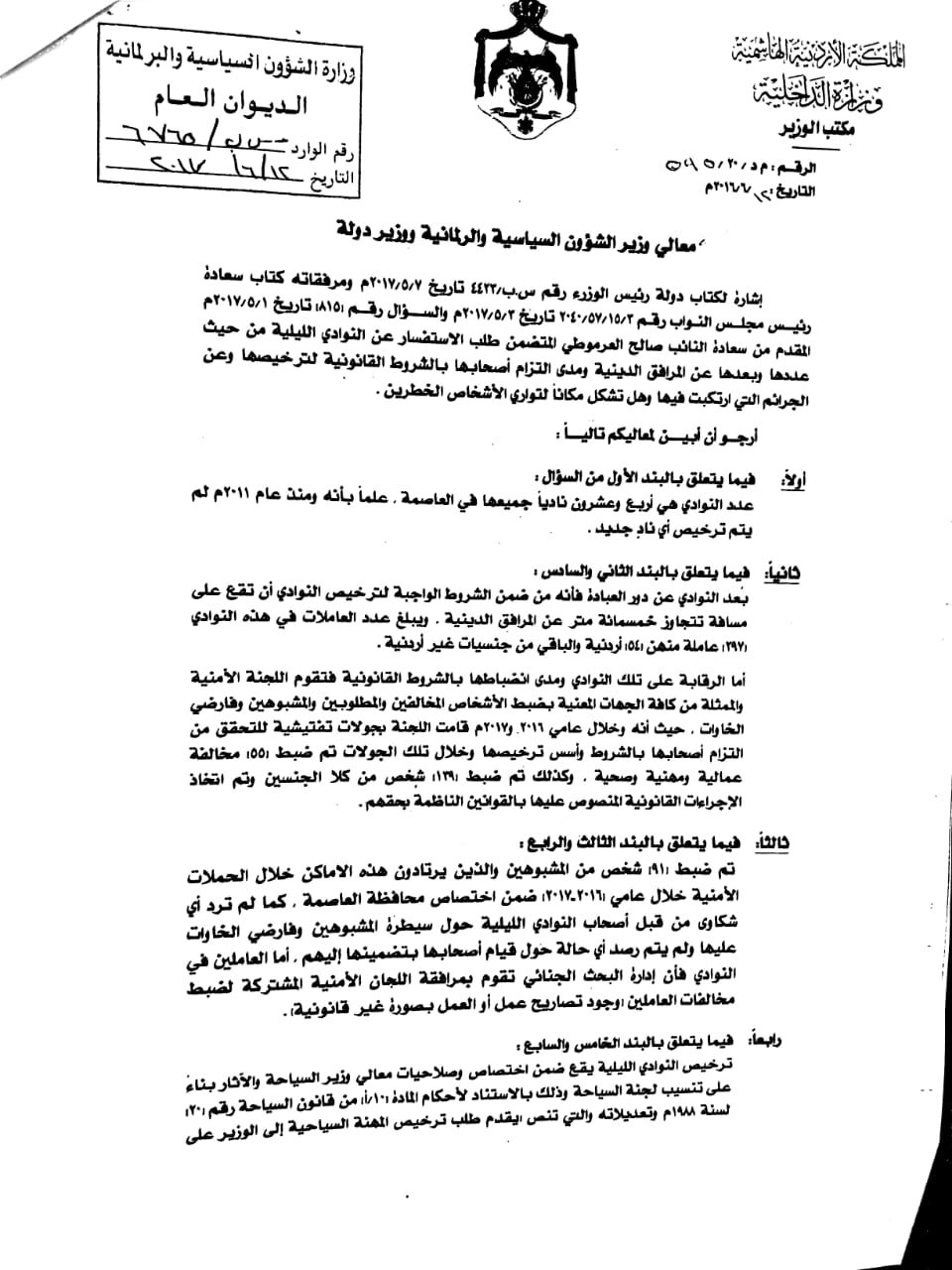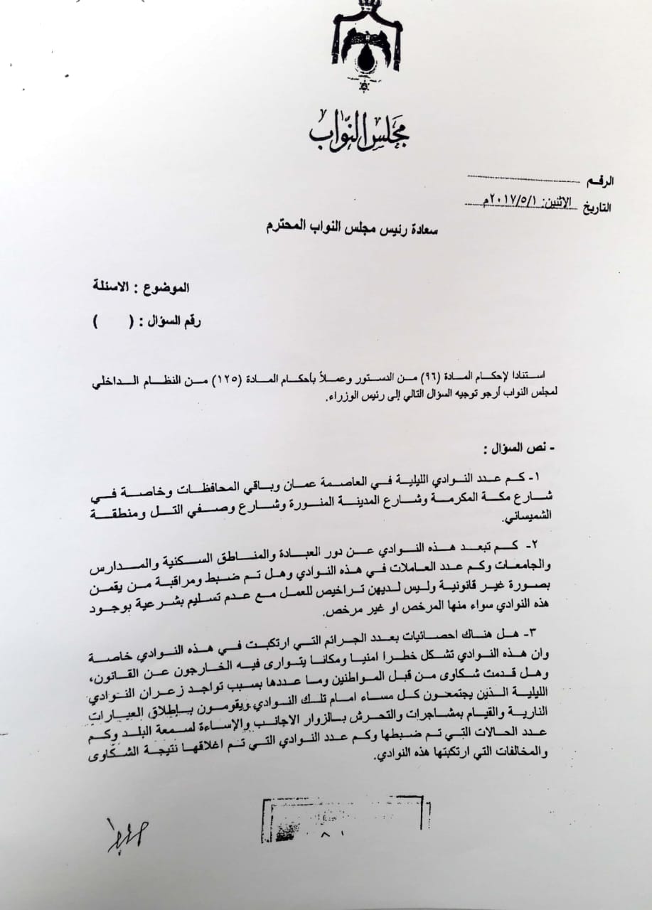 العرموطي : الحكومة لم تقدم جواباً شافياً حول الأندية الليلية