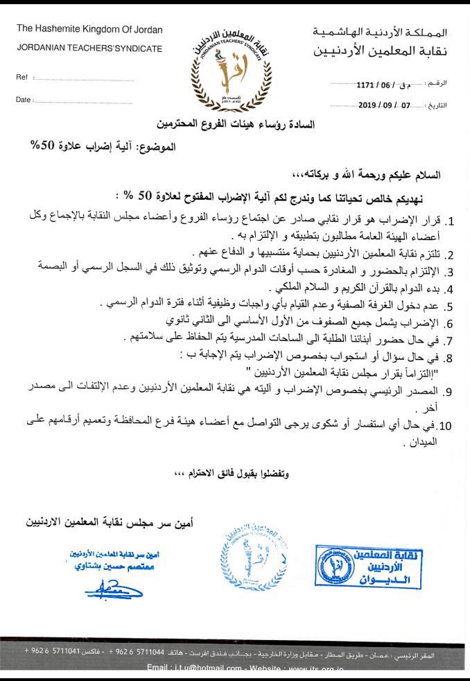 9. المصدر الرئيسي بخصوص الإضراب و آليته هي نقابة المعلمين الأردنيين وعدم الإلتفات الى مصدر أخر .