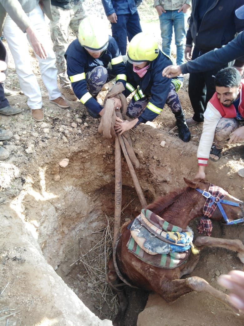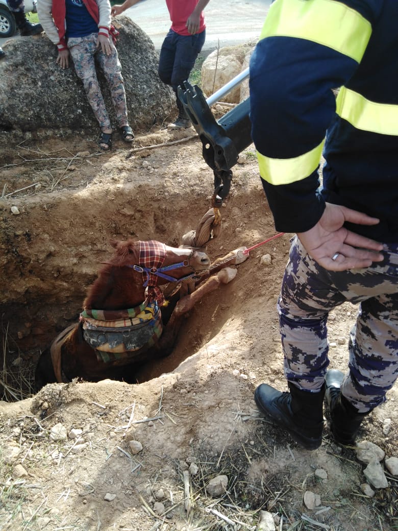 نيسان ـ تمكنت كوادر الإنقاذ في مديرية دفاع مدني غرب عمان من إنقاذ حصان وقع داخل حفرة يقدر عمقها بمترين بمنطقة عراق الأمير .