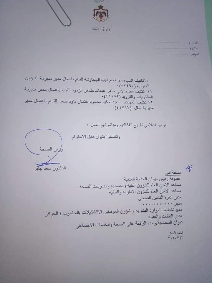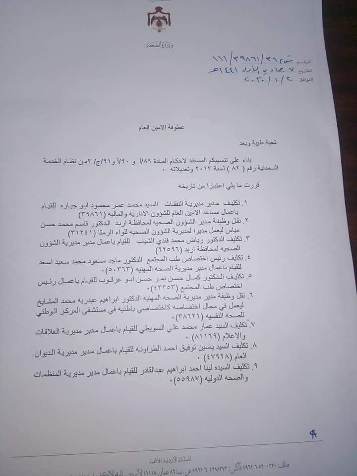 نيسان ـ قرر وزير الصحة الدكتور سعد جابر اجراء تشكيلات واسعة لكبار الموظفين. وشملت التشكيلات نقل 12 مديرا في مختلف دوائر ومديريات الوزارة على النحو التالي :