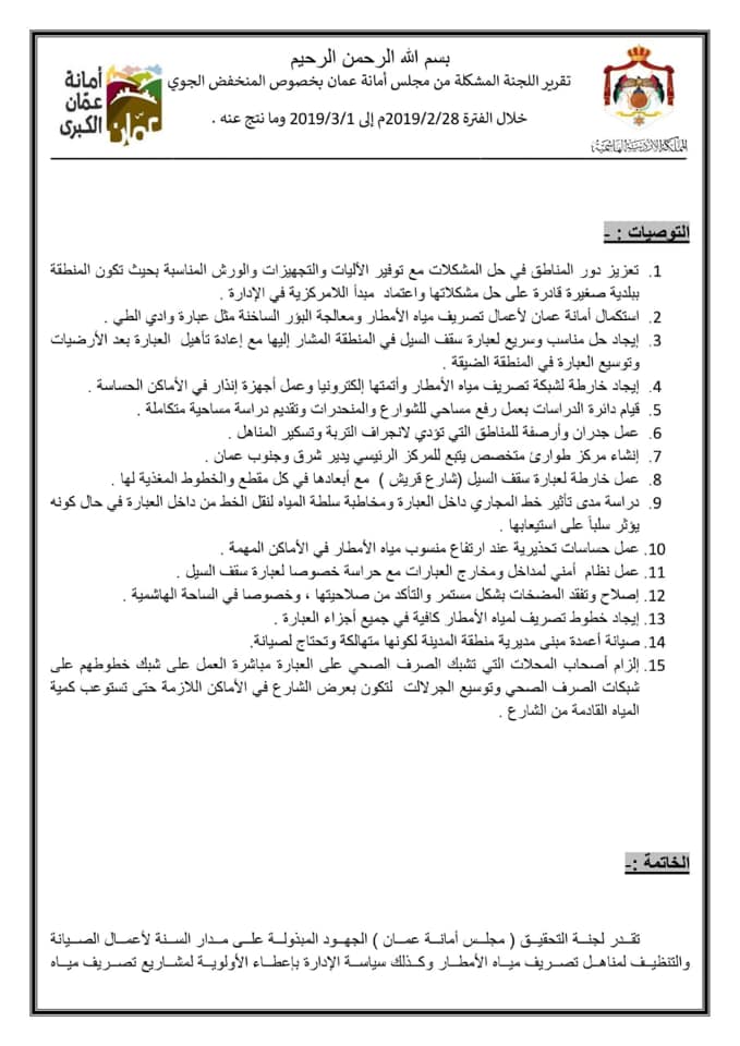 توصيات لجنة التحقق التي كنت رئيسها بفتره المنخفض الجوي بتاريخ ٢٠١٩/٢/٢٨ وقمنا بتسليم تقريرنا لمعالي امين عمان.. وهذه هي توصياتنا.