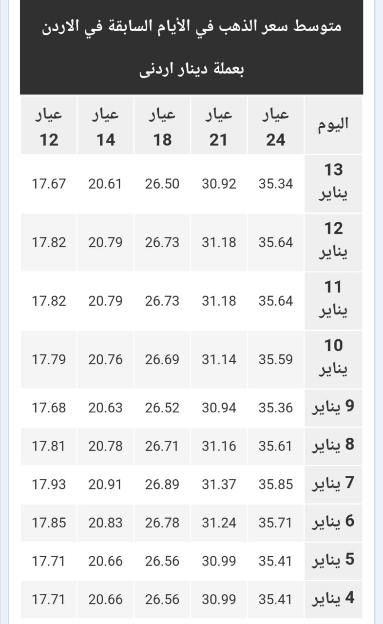 ويشمل التقرير أسعار المعدن بجميع عياراته (عيار 24, 22, 18, 14, 12) في الاردن.