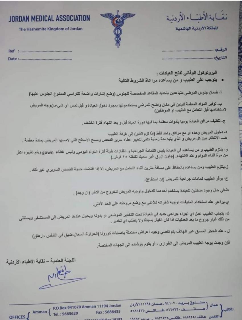 نيسان ـ أصدرت اللجنة العلمية لنقابة الاطباء اليوم السبت، البروتوكول الوقائي لفتح العيادات الطبية.