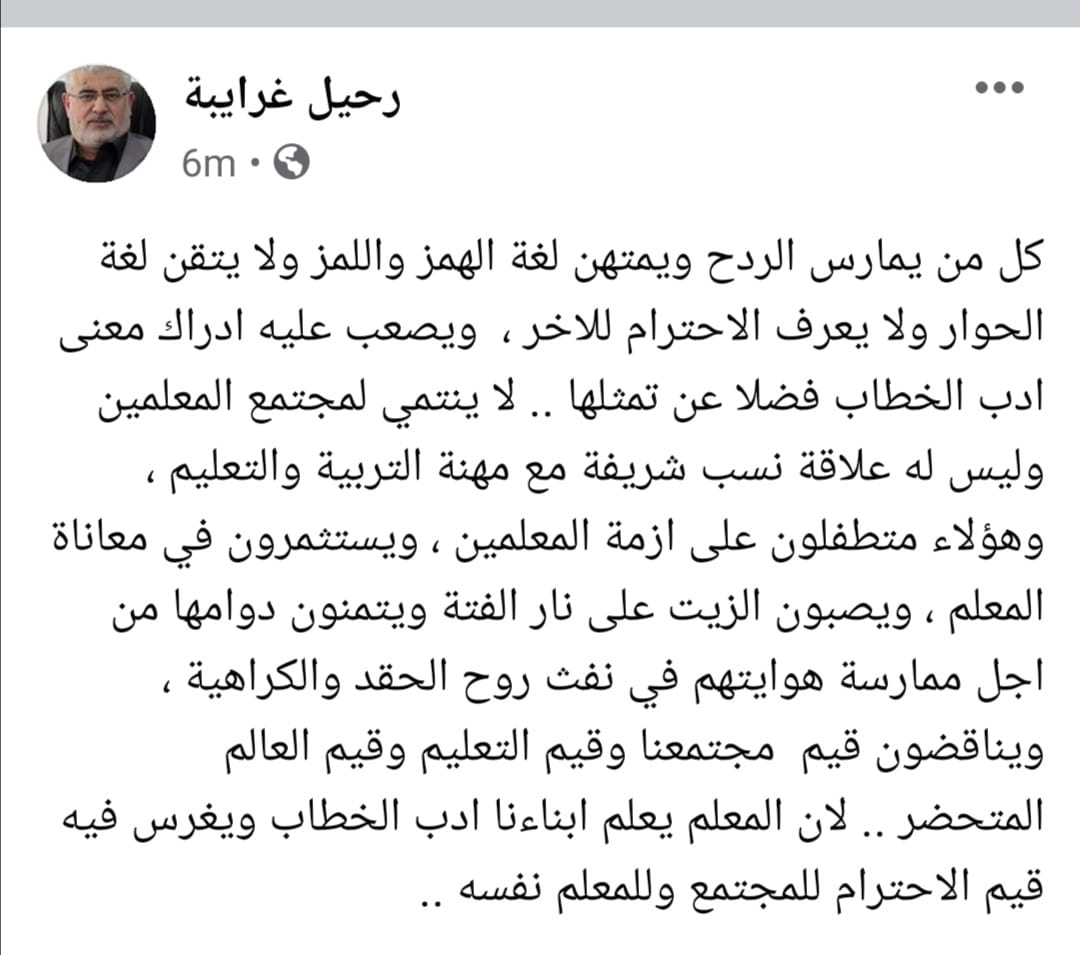 وقال الغرايبة ان كل من يمارس الردح ويمتهن لغة الهمز واللمز ولا يتقن لغة الحوار ولا يعرف الاحترام للاخر، ويصعب عليه ادراك معنى ادب الخطاب فضلا عن تمثلها .. لا ينتمي لمجتمع المعلمين وليس له علاقة نسب شريفة مع مهنة التربية والتعليم.