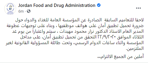 نيسان ـ وجه مدير عام المؤسسة العامة للغذاء والدواء الدكتور نزار مهيدات، بالتحقق من تحميل تطبيق أمان على مداخل المؤسسة وأثناء ساعات الدوام الرسمي اعتبارا من الثلاثاء، وتحت طائلة المسؤولية لغير الملتزمين.