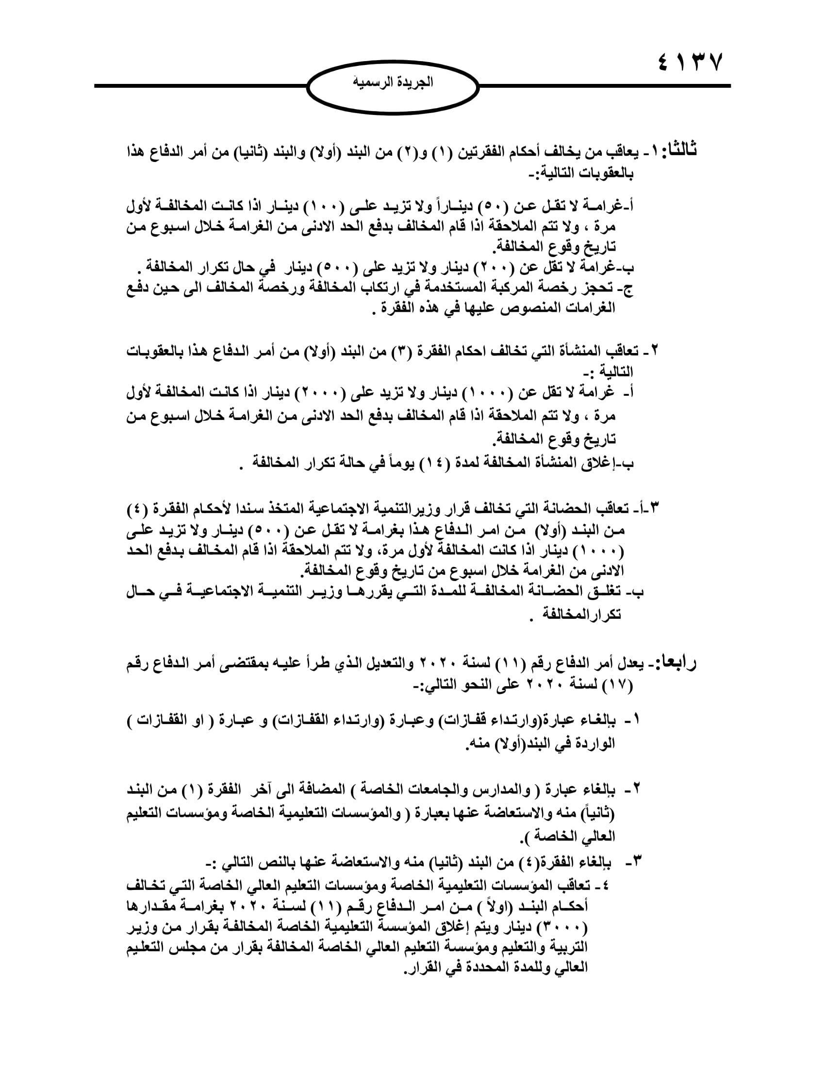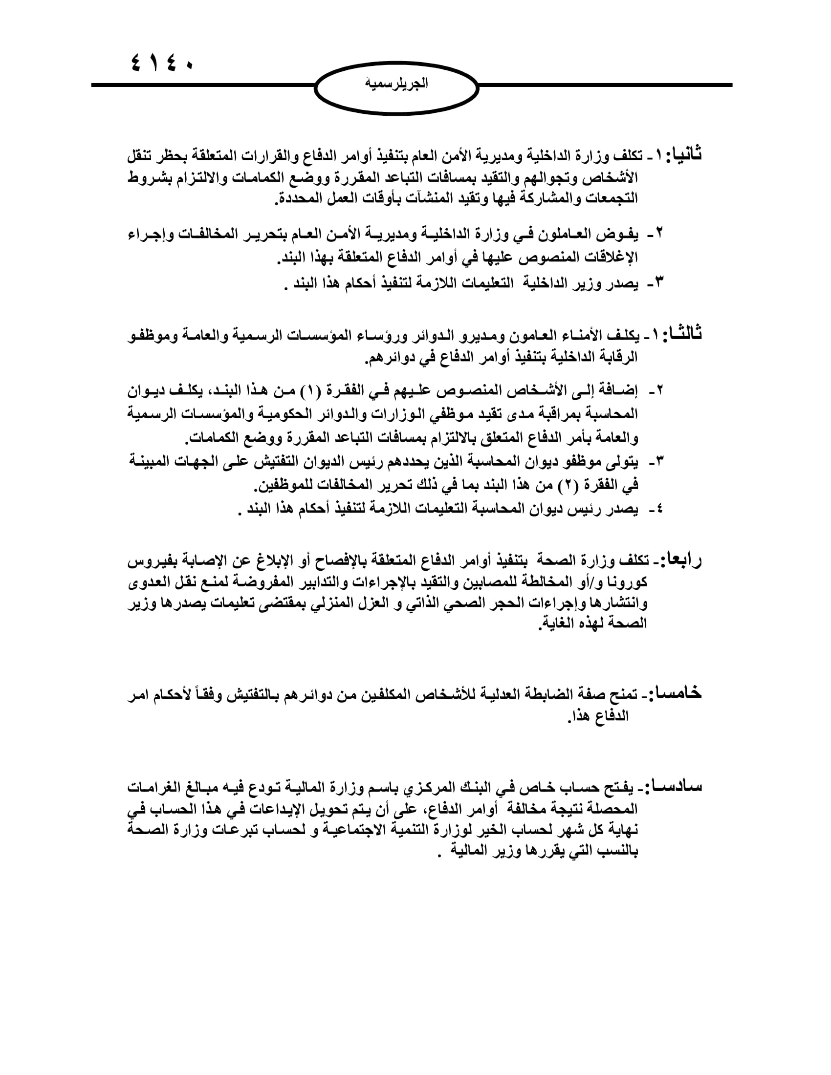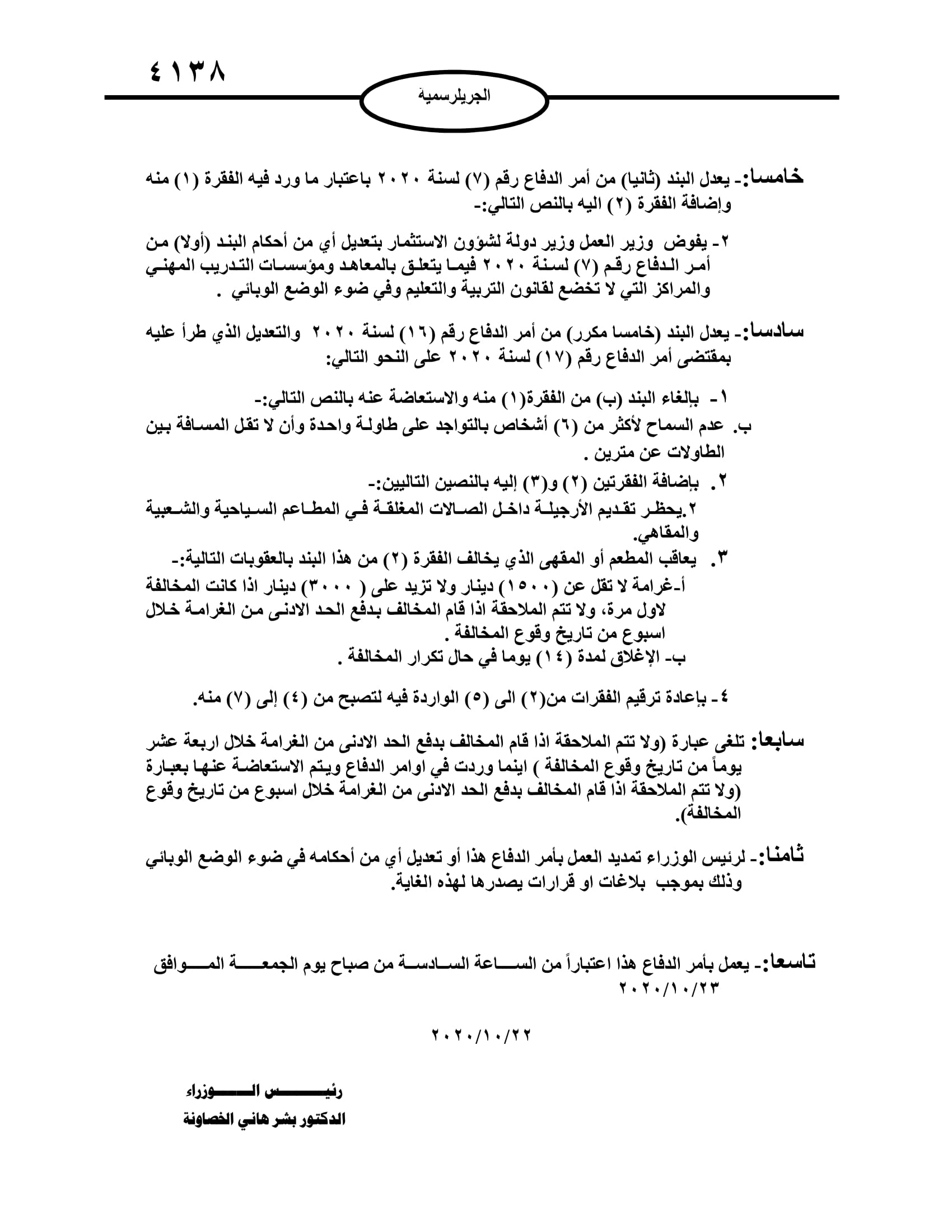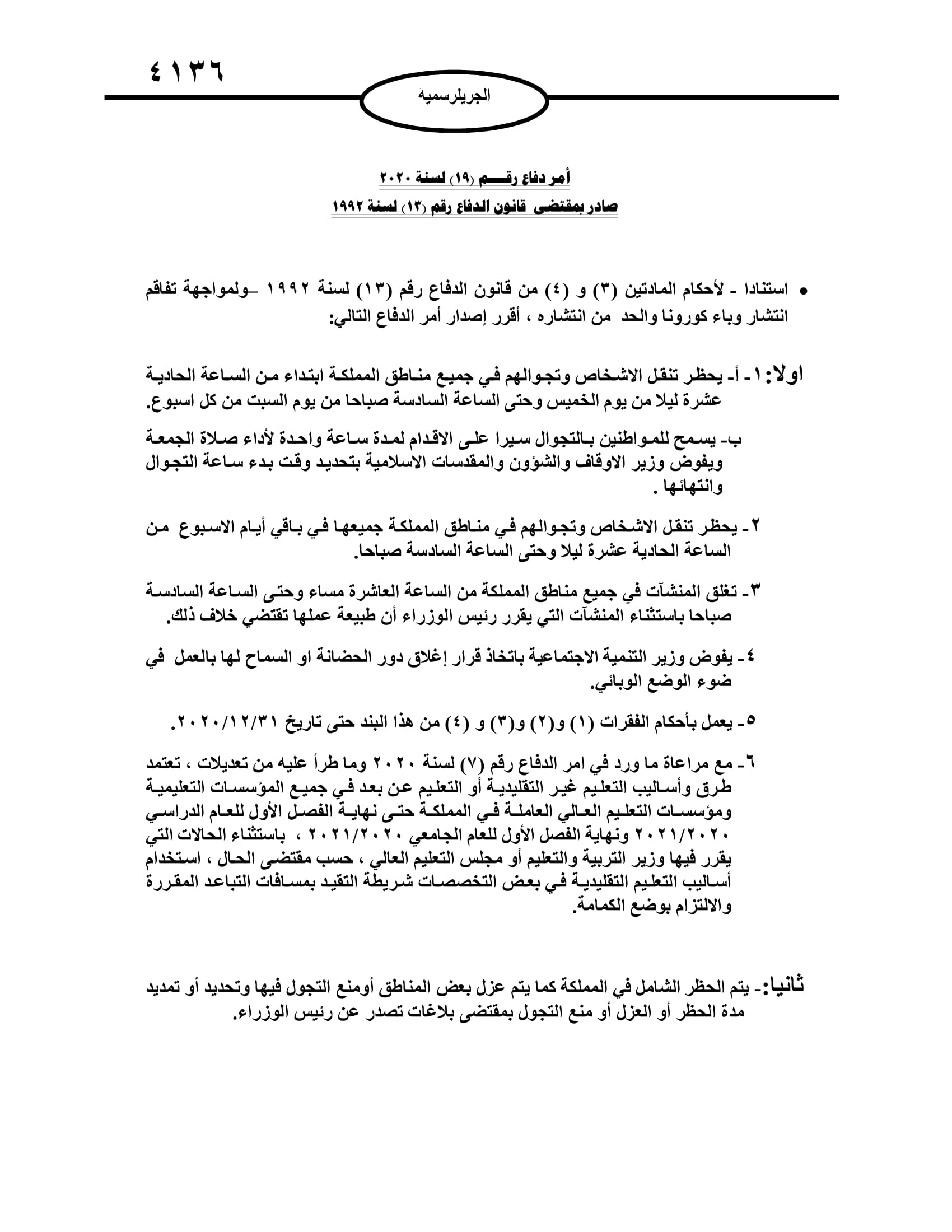 نيسان ـ نشر عدد الجريدة الرسمية الصادر الخميس نصي أمري الدفاع 19 و 20 والمتعلقان بالسماح باداء صلاة الجمعة في المساجد خلال الحظر الشامل وإعادة فتح الحضانات وتفويض وزيري الأوقاف والشؤون والمقدسات الإسلامية والتنمية الاجتماعية بالصلاحيات الإجرائية في بخصوصهما.