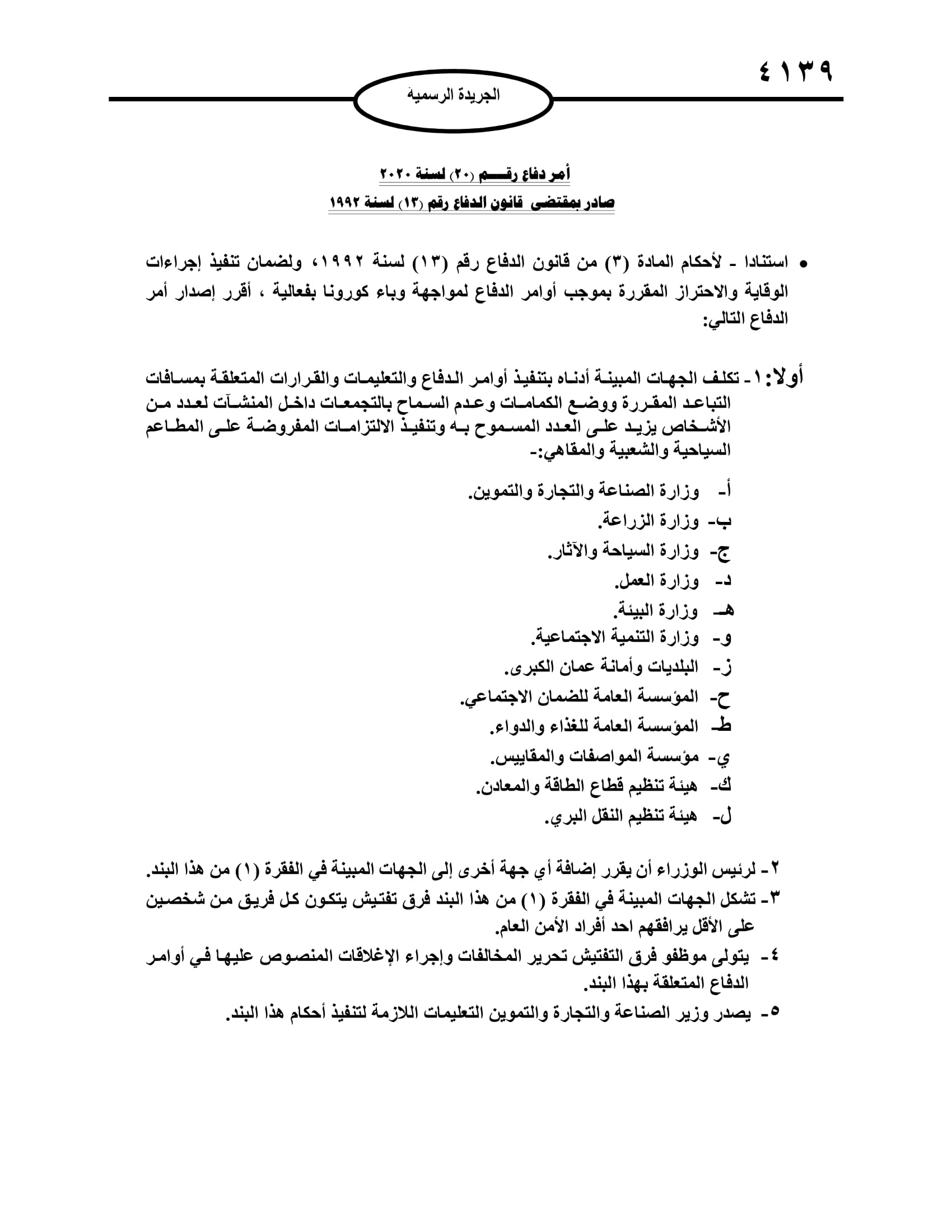 وتضمن أمر الدفاع 20 زيادة عدد الجهات الحكومية والرسمية المخولة بالتفتيش على الالتزام بسبل الوقاية والتدابير الاحترازية ومنع الازدحام ومخالفة غير الملتزمين، بحيث أصبحت 12 جهة حكومية ورسمية بالإضافة إلى مديرية الأمن العام، مع إمكانية زيادة عدد هذه المؤسسات إن تطلب الأمر.