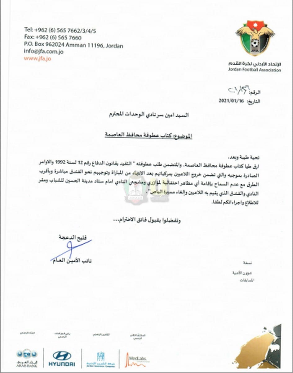 نيسان ـ وجه الاتحاد الأردني لكرة القدم، كتابا لنادي الوحدات يتضمن طلب محافظ العاصمة والمتضمن التقيد بقانون الدفاع رقم 12 لسنة 1992 والأوامر الصادرة بموجبه.