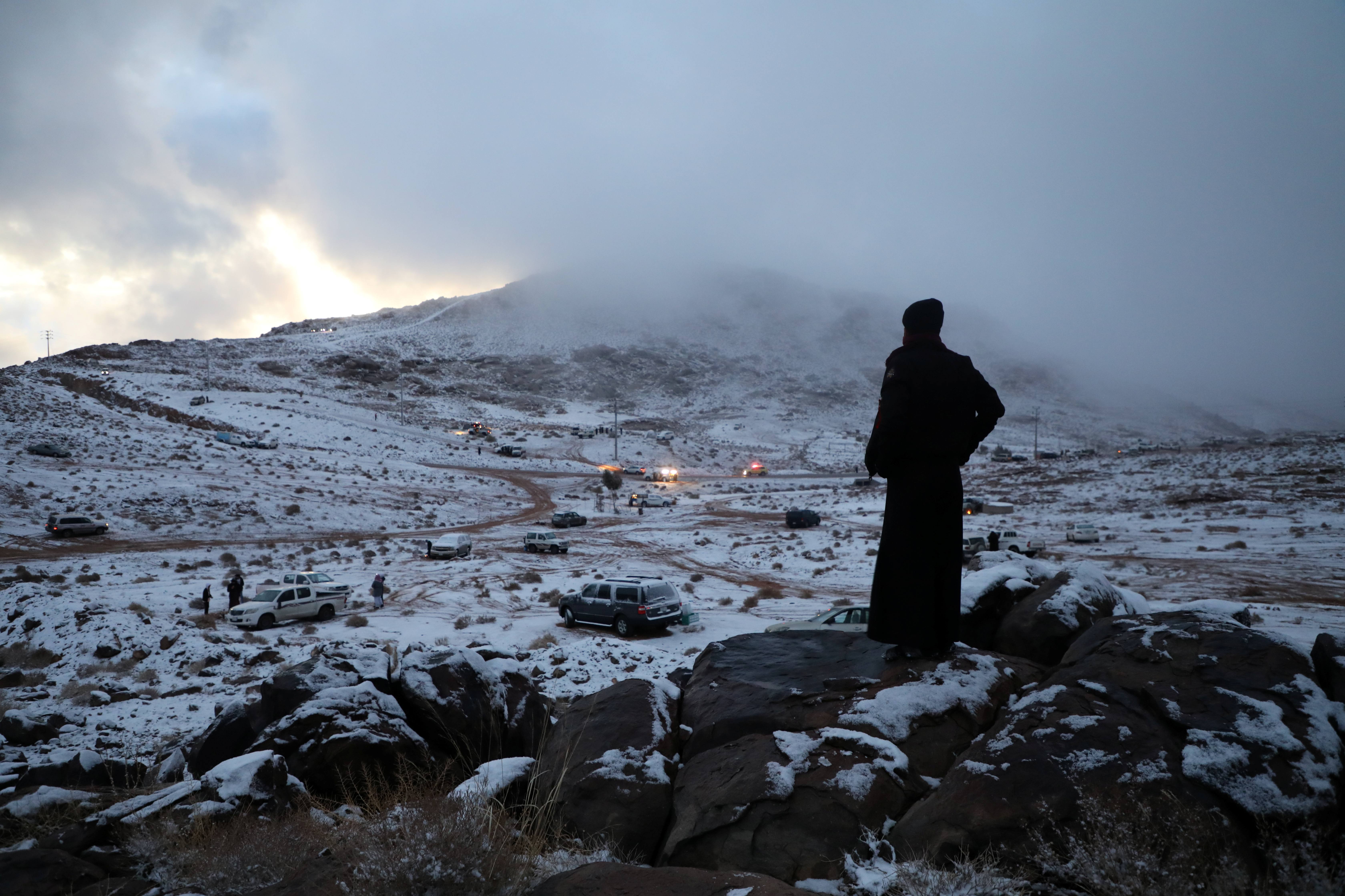ولاقت الصور المنشورة تفاعلا واسعا في المملكة التي تخيم على معظمها الأجواء الصحراوية، والتي لا تشاهد فيها الثلوج عادة بهذا الشكل.
