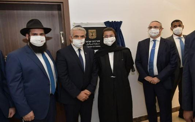 وقالت وزارة الخارجية الإسرائيلية في بيان، اليوم: "في احتفال مثير قاده وزير الخارجية الإسرائيلي، يائير لبيد، ووزيرة الثقافة والشباب الإماراتية، نورا الكعبي، أقيمت مراسم وضع ميزوزا، ( الميزوزة هي رمز ديني يهودي يوضع على مداخل الأماكن) في السفارة الإسرائيلية في أبوظبي".