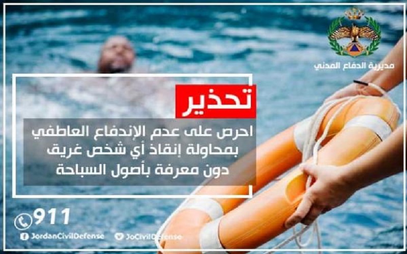 وأكد الدفاع المدني في ادراج عبر فيسبوك السبت، ضرورة الحرص على عدم الإندفاع العاطفي بمحاولة إنقاذ أي شخص غريق دون معرفة بأصول السباحة.