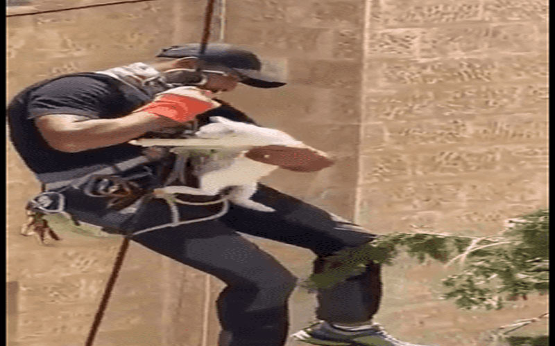 وقال المحسيري انه يمارس رياضة الإنزالات الجبلية منذ فترة، وتبلغ بوجود قطة عالقة في تلاع العلي بالعاصمة عمان، حيث اجرى دراسة ومسح للموقع ونفذ عملية الانقاذ.