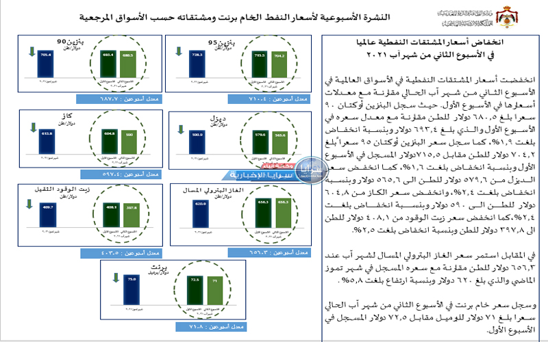 كما سجل سعر البنزين أوكتان 95 سعراً بلغ 704.2 دولار للطن مقابل 715.5دولار المسجل في الأسبوع الأول وبنسبة انخفاض بلغت 1.6%، كما انخفض سعر الديزل من 579.6 دولار للطن الى 565.6 دولار وبنسبة انخفاض بلغت 2.4%، وانخفض سعر الكاز من 604.8 دولار للطن الى 590 دولار وبنسبة انخفاض بلغت 2.4%،كما انخفض سعر زيت الوقود من 408.1 دولار للطن الى 397.8 دولار للطن وبنسبة انخفاض بلغت 2.5%.