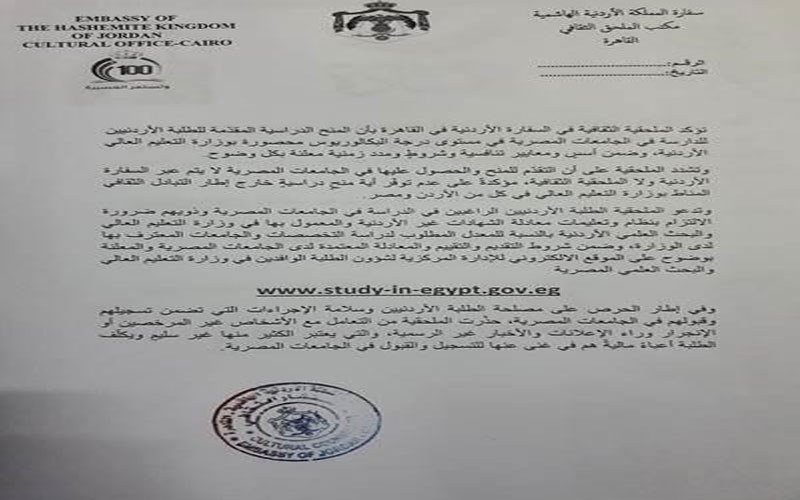 وفي إطار الحرص على مصلحة الطلبة الأردنيين وسلامة الإجراءات التي تضمن تسجيلهم وقبولهم في الجامعات المصرية، حذّرت الملحقية من التعامل مع الأشخاص غير المرخصين أو الإنجرار وراء الإعلانات والأخبار غير الرسمية، والتي يعتبر الكثير منها غير سليمٍ ويكلّف الطلبة أعباءً ماليةً هم في غنى عنها للتسجيل والقبول في الجامعات المصرية.